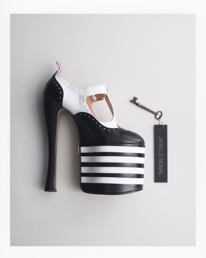 janelle wears a custom thom browne oversized trompe l’oeil suit cape half realized in 3-ply mohair with white radial stitch grosgrain tipping, and half finished in embroidered pinstripe intarsia into red double duchess silk, with embroidered radial outlines in grosgrain ribbons… detailing…