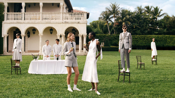 let the games begin. lines define the court’s edges, burgundy stripes and silk jacquard ties set the bold apart. singles, doubles, guests are dressed to play. crisp white chinos, his and hers. a game of gentlemen and ladies. all the while a shortened hem, polos with lush pops of color, set the stage for a quiet rebellion. rules may be broken. who’s keeping score…Â