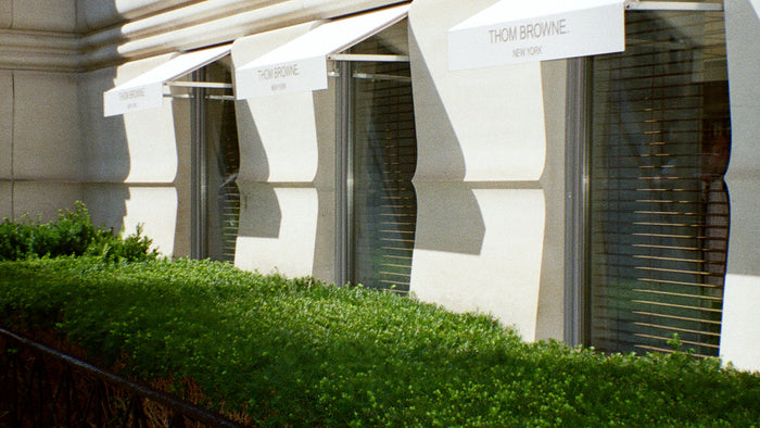 friends and family joined thom browne for cocktail hour to celebrate the opening of thom browne madison. clad in breezy seersucker, guests were served crisp coupes of champagne and pastel ice cream scoops as they mingled in front of a hector topiary.