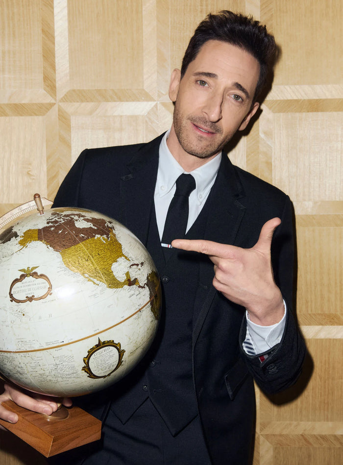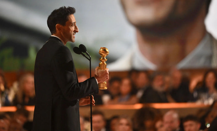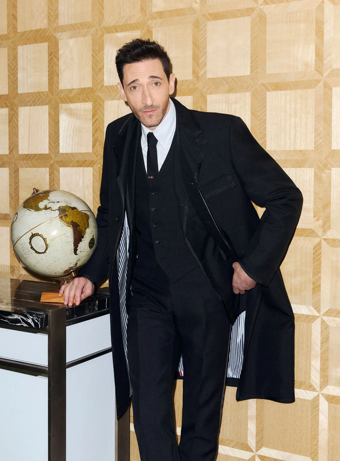 adrien brody wears thom browne made-to-measure to accept the award for best performance by a male actor in a motion picture - drama, for his role in the brutalist at the 82nd annual golden globe awards.