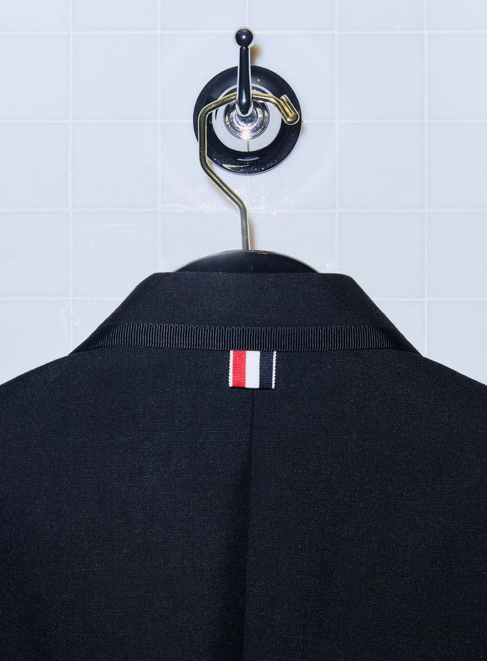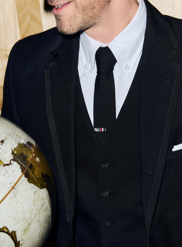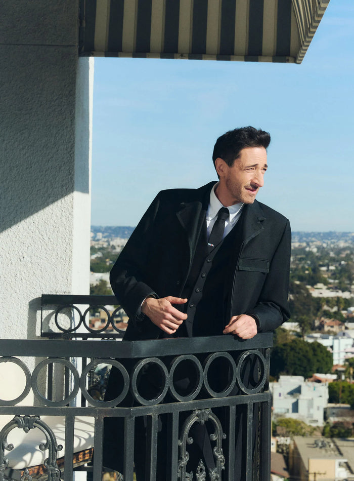 adrien wears a three-piece tuxedo and matching chesterfield overcoat in black 3-ply mohair with grosgrain tipping, paired with classic wingtip boots in black pebble grain leather.