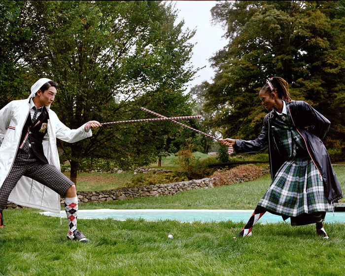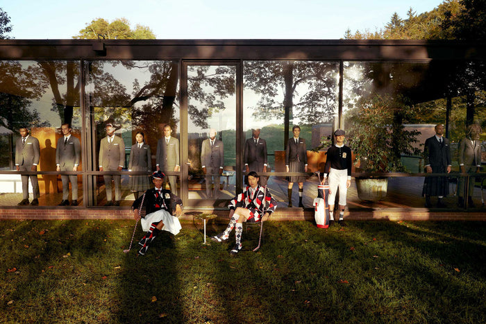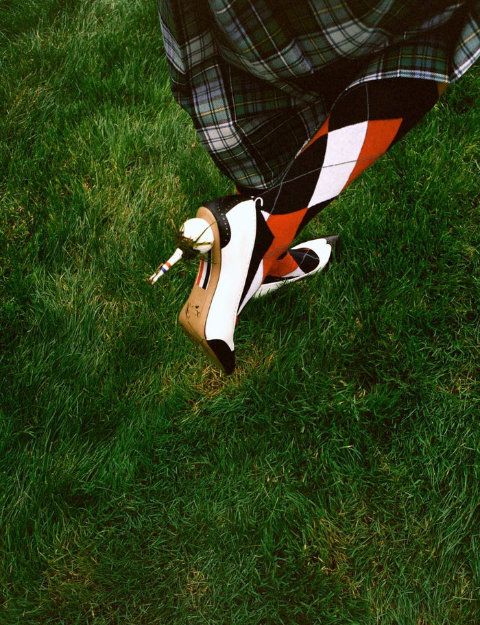 timeless argyle and tartan set the tone for tailoring and knitwear. light pink and blue are juxtaposed with rich red and navy as seen in intarsia detailing and cashmere jacquard. sweatsuits are updated with pompom detailing inspired by vintage golf club covers. uncon- structed blazers and easy cotton polo shirts are emblazoned with a signature golf crest. a custom scenic golf design featuring the pin flag is integrated into cardigans, shirts and leather goods. pebble grain shoes feature kilt fringe and “golf tee”-inspired heels.