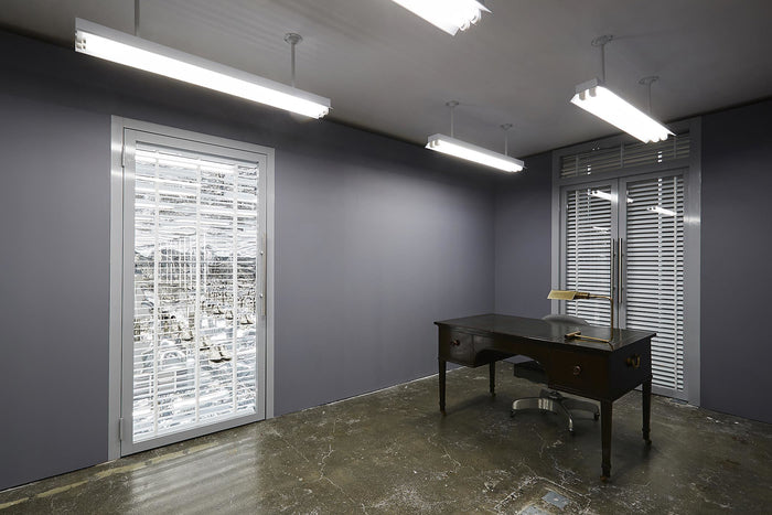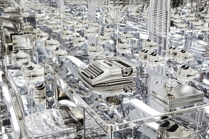 The first room pays homage to installations originally created by Browne for Le Bon Marche Rive Gauche (2015) and the Cooper Hewitt Museum (2016), now shown for the first time in Asia. Covered completely in mirrors, the installation room features silver plated Thom Browne wing-tip shoes and mid-century design objects, all specifically positioned to evoke a sense of strict uniformity.