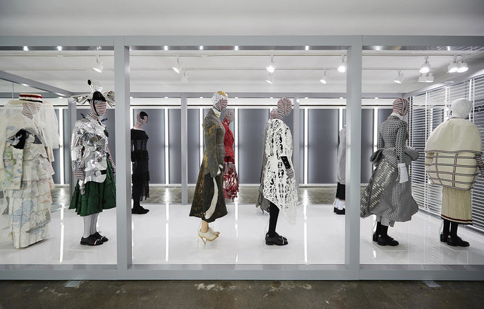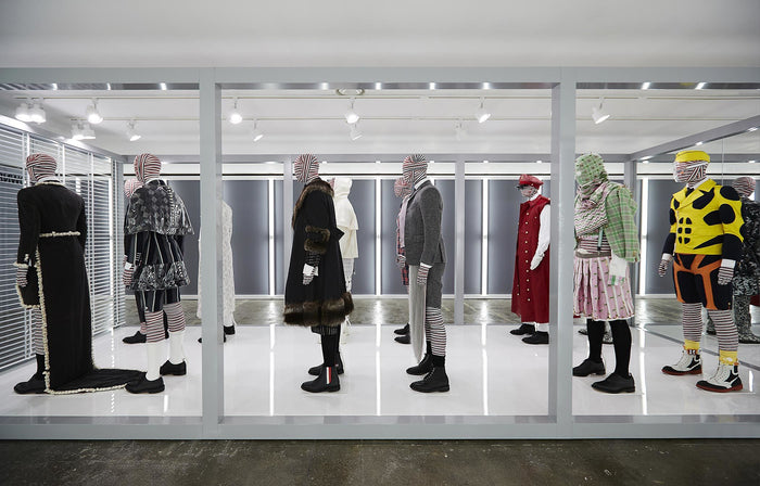 This exhibition explores the creative world of Thom Browne including ten years of archival creations and reimagined conceptual projects, all exhibited using Browne’s signature 1950s-inspired interior design aesthetic. The space is divided into three rooms, each exploring different concepts that are important to the brand ethos.