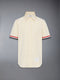 A subtle gingham pattern makes you do a double take—a testament to Thom’s meticulous eye for detail and perfectionism. Elevated with our signature grosgrain trim at the cuffs, this shirt blends classic design with a Thom Browne twist. A sizable chest pocket offers functional storage, while our iconic name tag applique at the hem adds the finishing touch.