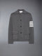 Polo collar jacket in dark grey cotton cashmere interlock with 4-bar stripe detail at left sleeve in white. Front button closure, buttoned flap front pockets, ribbed back yoke. Signature striped grosgrain loop tab at back of neck.