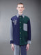 Oversized snap front shirt jacket in Fun-Mix blue and green corduroy with broderie anglaise paisley patches embroidered through chest, hem, and back. Brass snap button closure, lined shirt collar, patch chest pocket, rounded hem. Buttoned cuffs. Seamed back yoke with locker loop. Self-lined with interior pocket and name tag. Signature striped grosgrain loop tab at back of neck.