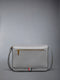 Reporter bag in blue pebble grain leather with black webbing strap. Flap top, 2-way zip pocket at front. Gold foil printed logo and signature striped grosgrain loop tab at entry.
