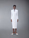 Moulded shoulder ankle length dress in allover wool crepe exudes Thom Browne's mastery of minimalistic design and tailored excellence. A front button closure runs down the center from top to bottom. Wear this silhouette alone or paired with silk organza tie applique shirt.