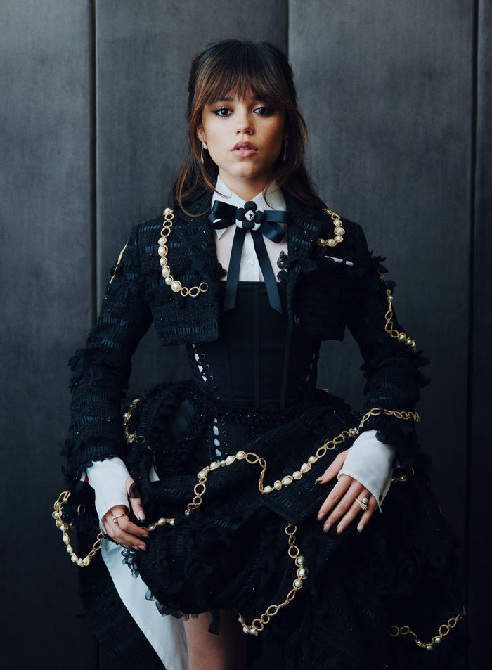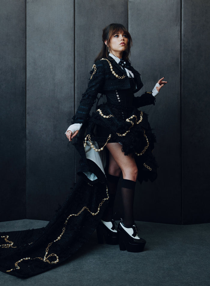 jenna ortega wears a black chiffon tweed cropped jacket, worn with a matching reconstructed coat, draped as a skirt over a black beaded tulle mini pannier, a mini black peau de soie corset dress with lacing detail, white organza shirt with a black silk moiré ribbon and camellia neck bow; with the jacket and skirt embroidered with gold bullion and pearl chains throughout; on a black chiffon tweed with over 1000 crystals; and black and white patent longwing brogue with sheer black four-bar socks.