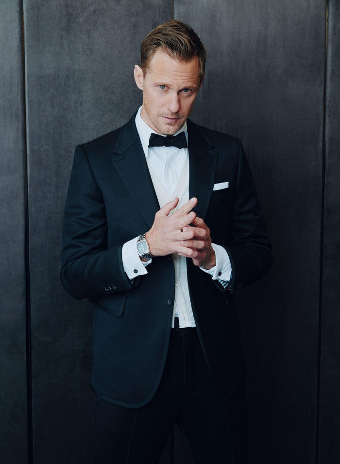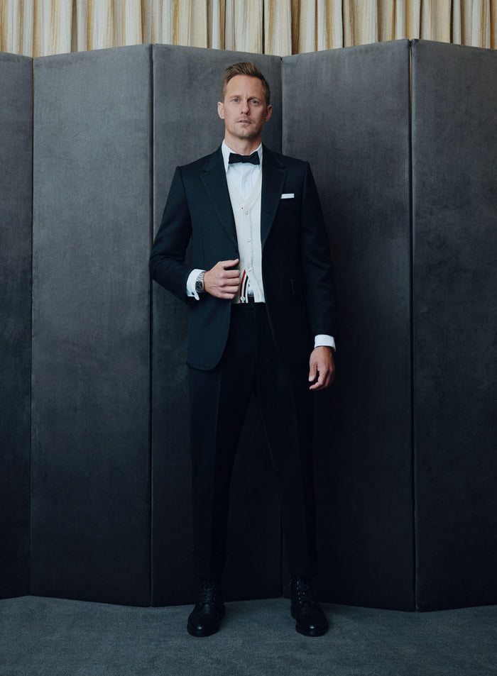 alexander skarsgard wears a classic fit 4 wide lapel tuxedo in black lightweight cavalry twill with tonal grosgrain tipping, classic knit vest in white cashmere, classic point collar tuxedo shirt with french cuffs in white piqué, classic bow tie in black silk faille and classic longwing boots in black lucido leather.