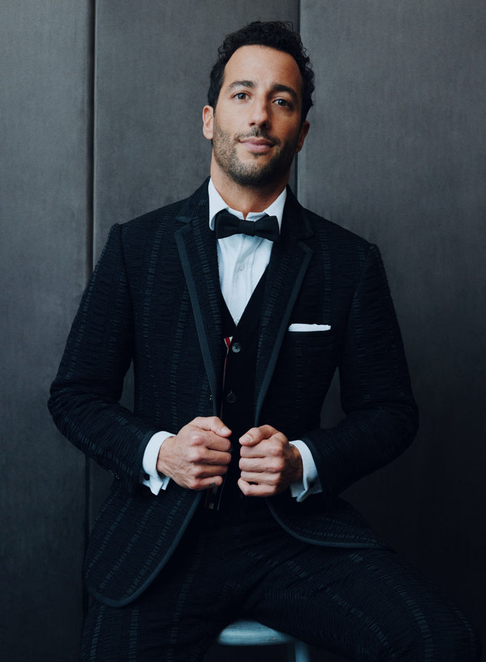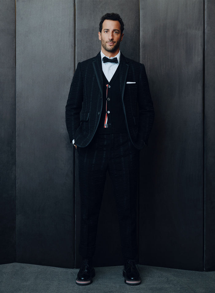 daniel ricciardo wears a classic fit 1 tuxedo in black grosgrain ribbon tweed with tonal tipping, classic four-bar knit vest in black cashmere, classic round collar tuxedo shirt with french cuffs in white piqué, classic bow tie in black silk faille and longwing brogues on hiking sole with red, white, and blue micro insert in black patent leather.