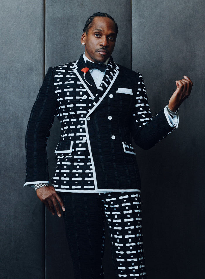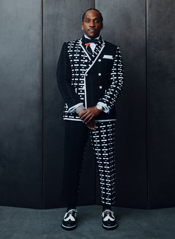 pusha t wears a classic fit 1 double-breasted tuxedo in fun-mix black and white grosgrain and satin ribbon tweed with white grosgrain tipping, classic round collar tuxedo shirt with french cuffs in white piqué, classic bow tie in black silk faille and longwing spectator brogues with pedestal in pebble grain leather.