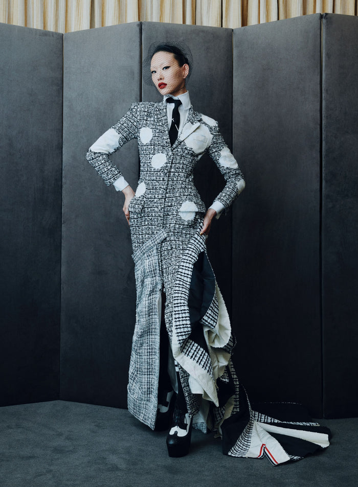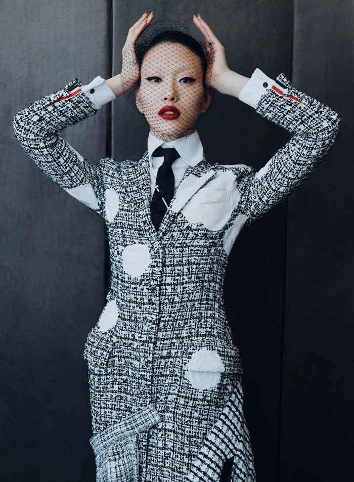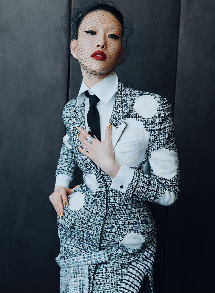 sora choi wears a down-filled oversized deconstructed coatdress in black and white check tweed with hand-gathered tulle tipping and appliqued mother of pearl camellias, gold bullion chains; underneath is a tailored jacket dress with reconstructed trousers and pleated skirt in black and white mix tweeds with seamed in silk intarsia camellia, worn with a high collar tuxedo shirt in white silk twill, black silk faille tie and longwing brogues on 170mm platform in black and white pebble grain leather; with a cartier diamond tie pin.