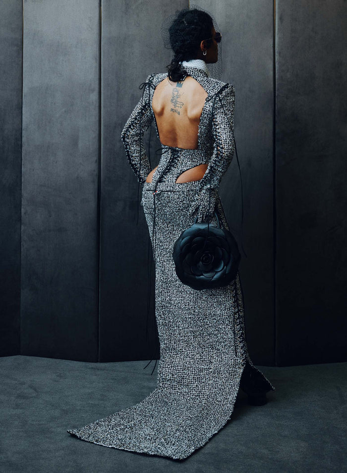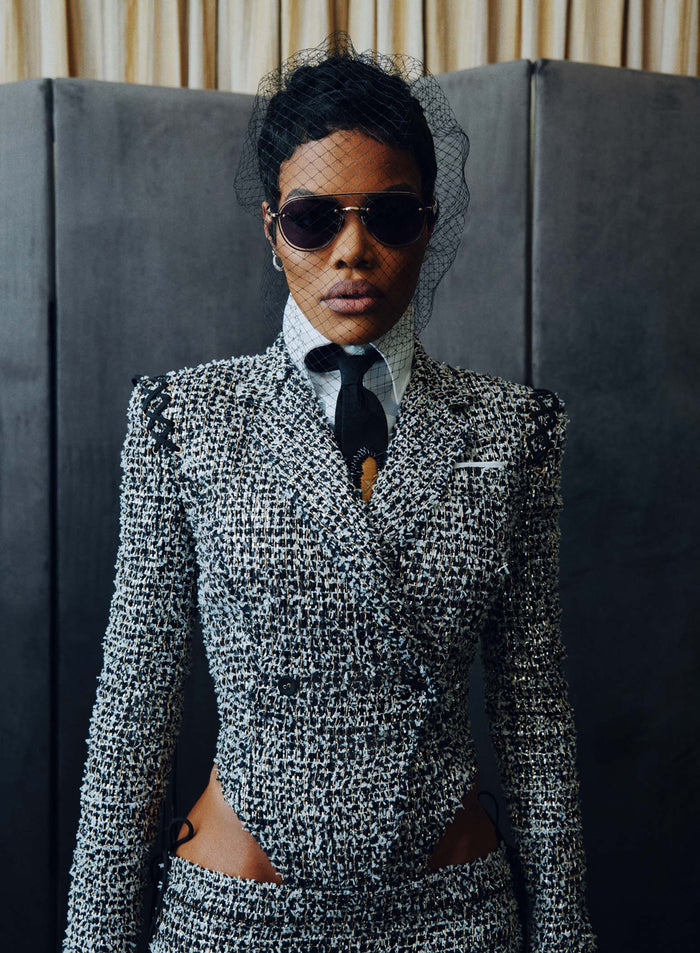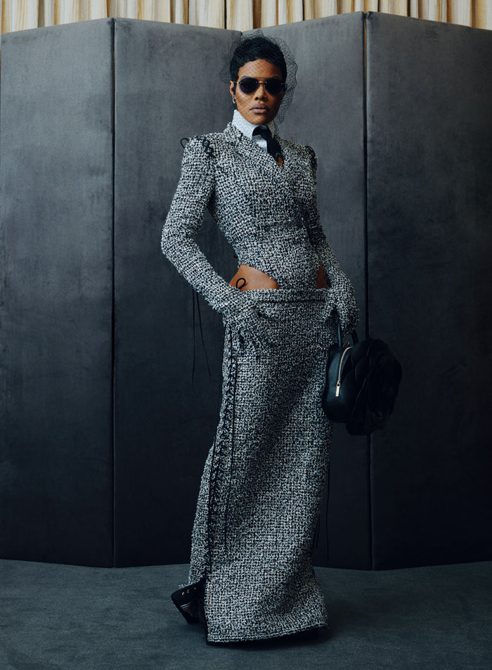 teyana taylor wears a backless tailored double-breasted jacket with full sleeves, worn with a matching dropped waisted skirt with lacing details in embroidered tweed consisting of woven gold and black bullion, silver badla with black and white eyelash yarn. worn with a high collar tuxedo shirt in white piqué, black silk faille tie with gold bullion and black pearl sagittarius charm; she carries a black pebble leather camellia bag, black patent longwing brogue with circle platform, and is adorned with a black diamond tulle veil.
