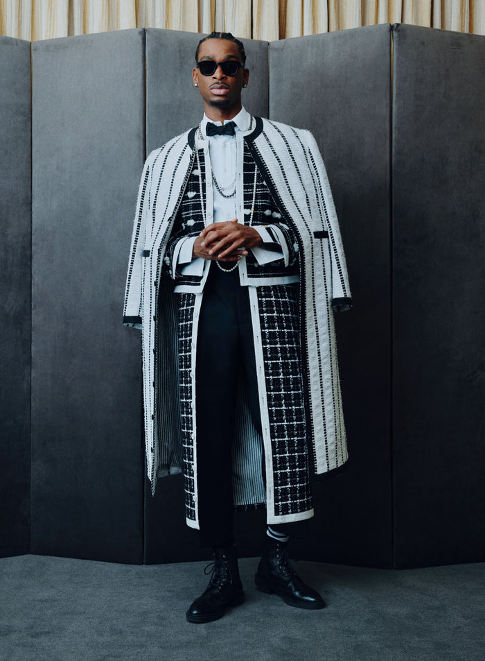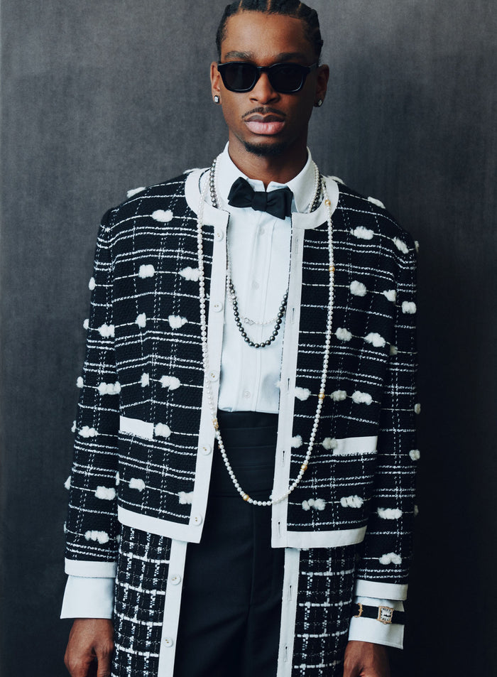 shai gilgeous-alexander wears an oversized cardigan coat in white grosgrain ribbon tweed with black silk faille cricket frame, oversized cardigan and skirt set in black and white pouf tweed and gunclub check tweed with white silk faille cricket frame; worn opened over a classic fit 5 tuxedo trouser in 3-ply mohair, classic round collar tuxedo shirt with french cuffs in white piqué, classic bow tie in black silk faille and classic longwing boots in black lucido leather.