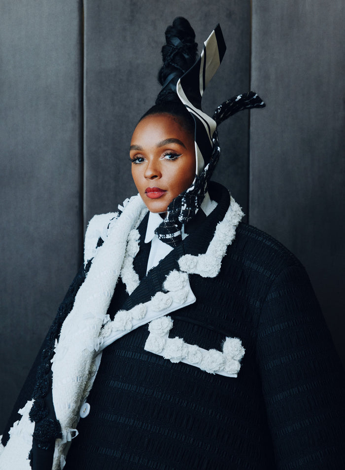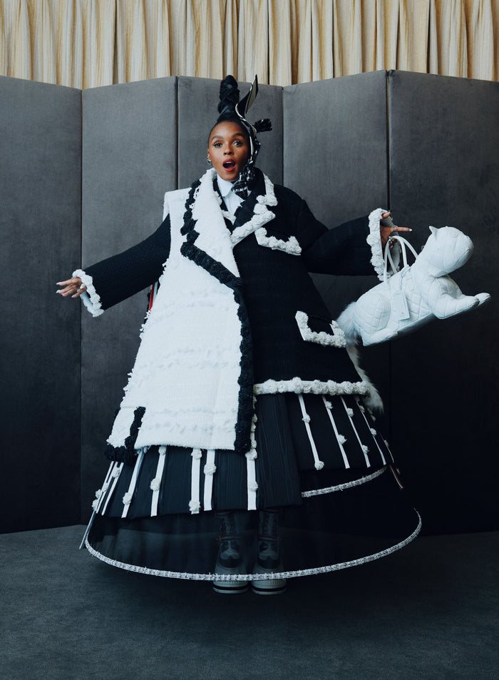 janelle monae wears an exaggerated black and white fun-mix tweed tuxedo suit in white chiffon, black grosgrain and white eyelash with black tulle tweed, tipped embroidered camellia flowers, black silk moiré pleated skirt with black silk organza inserts, classic round collar tuxedo shirt in white piqué; underneath is a circular black tulle pannier dress with black and white eyelash boned tipping, woven with a white four-bar pearl details; worn with a black sequin and eyelash yarn bikini with pearl strings; and astronaut boot in white rubber leather and black patent giemme; and white pebble leather quilted chopuette bag.