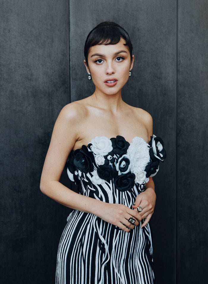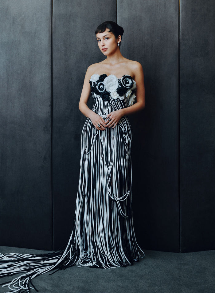 olivia rodrigo wears a black & white silk and tweed camellia flower dress made from a variety of tweeds, leathers and silk faille, moiré, organza, gazar with the black and white silk satin stems all made and applied by hand; and black patent longwing brogues with circle platform.