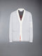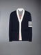 This cardigan highlights a seasonal crest rendered in intarsia jacquard, uniting core Thom Browne emblems—the number 65, athletic motifs, and Hector—in a refined composition of texture and tone. Knit with a structured hand, the silhouette blends the ease of a rugby fit with the precision of tailored knitwear. Finished with engineered 4-bar detailing and RWB trims, it reflects a layered narrative of craftsmanship, heritage, and play.