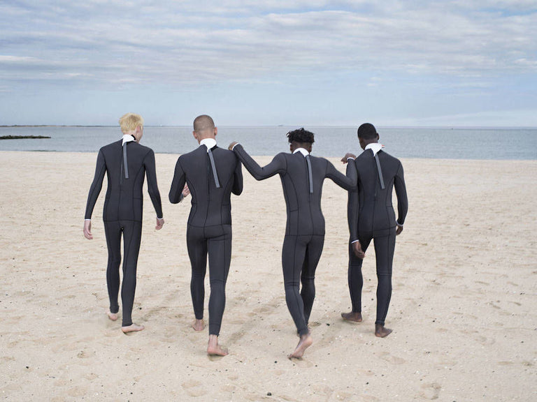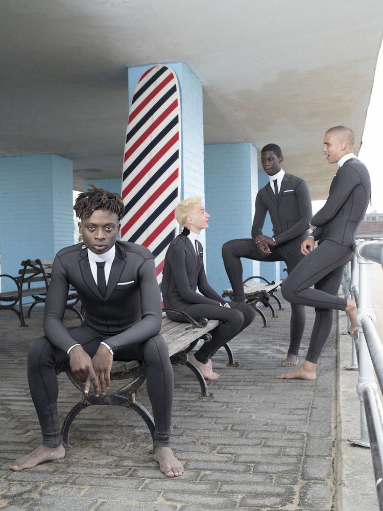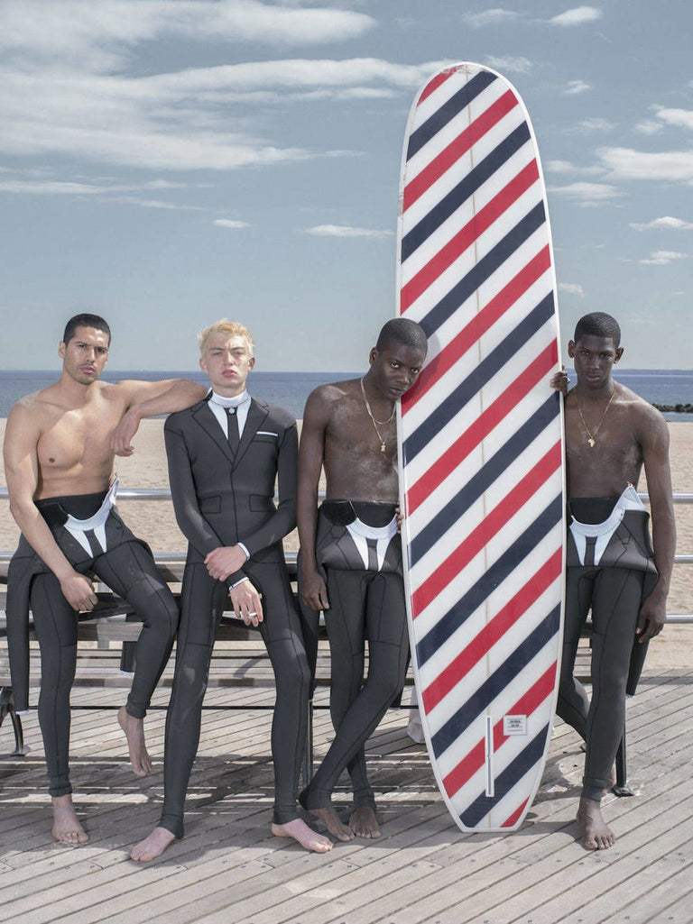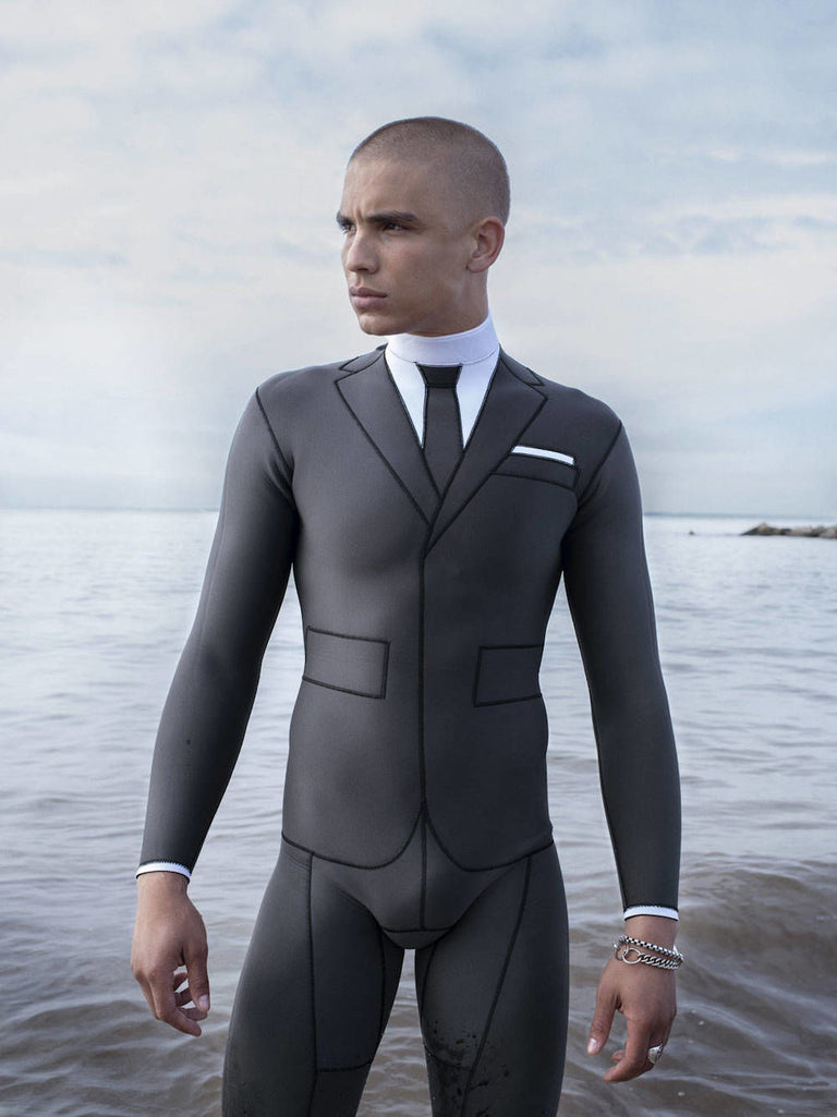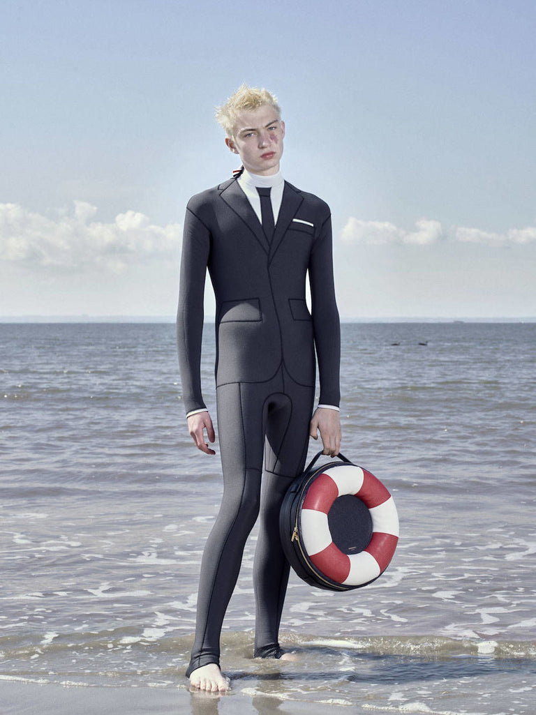 the thom browne beachwear collection is inspired by two strong but disparate areas of design, suiting and sport, fused together by the visual illusion of trompe l'oeile. in this version of the iconic wetsuit, elements of thom browne tailoring are reduced to coversitched seam details: the two piece sleeve, the topcollar and lapel of the jacket, the point collar and single knot of the tie, even the jacket's cutaway and the trouser cuffs. the singular wetsuit design is sleek and ergonomic, fitted to the body and protective of it.