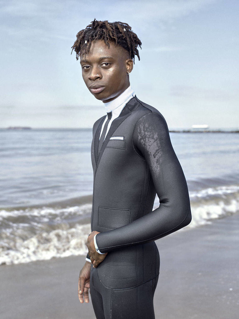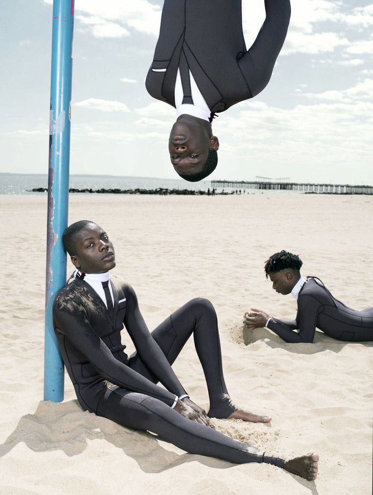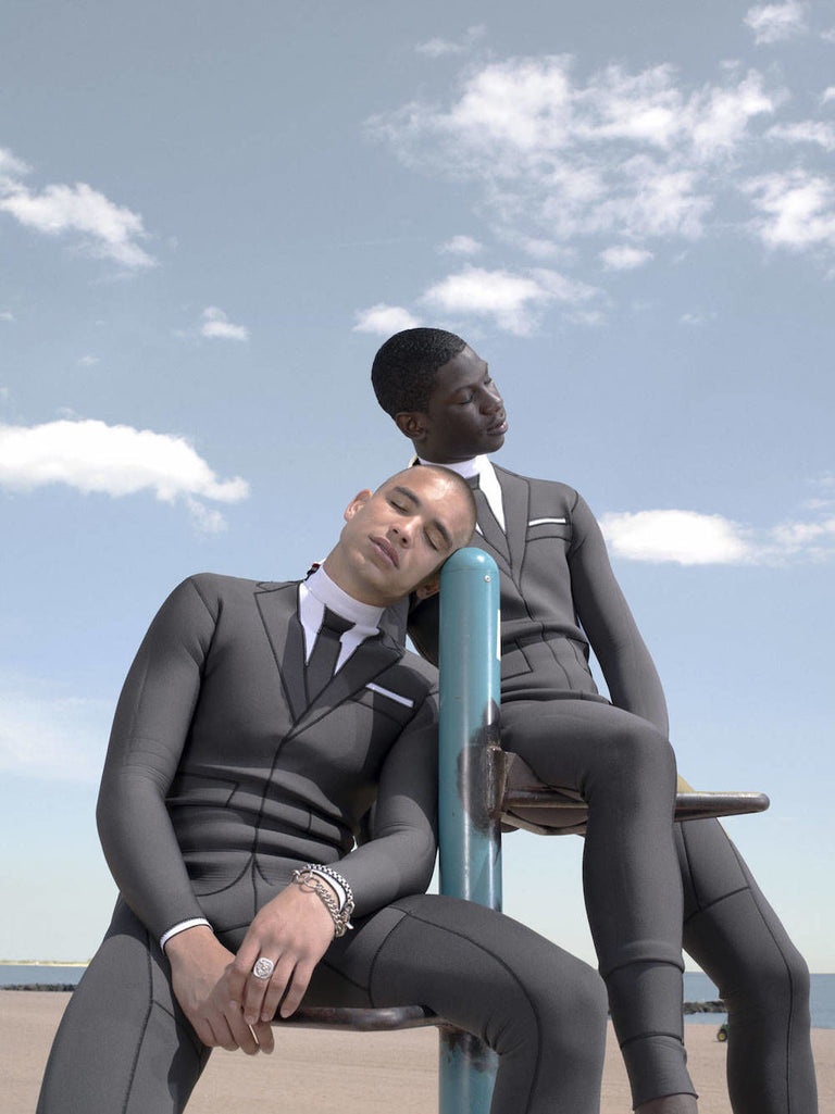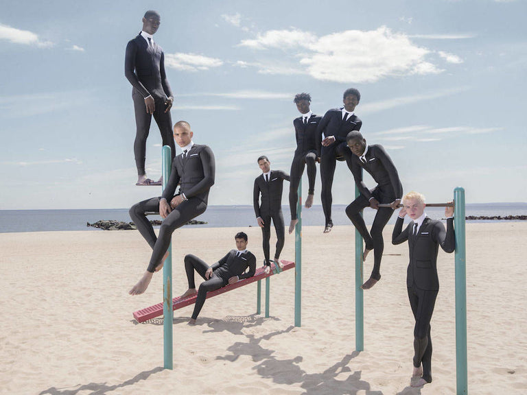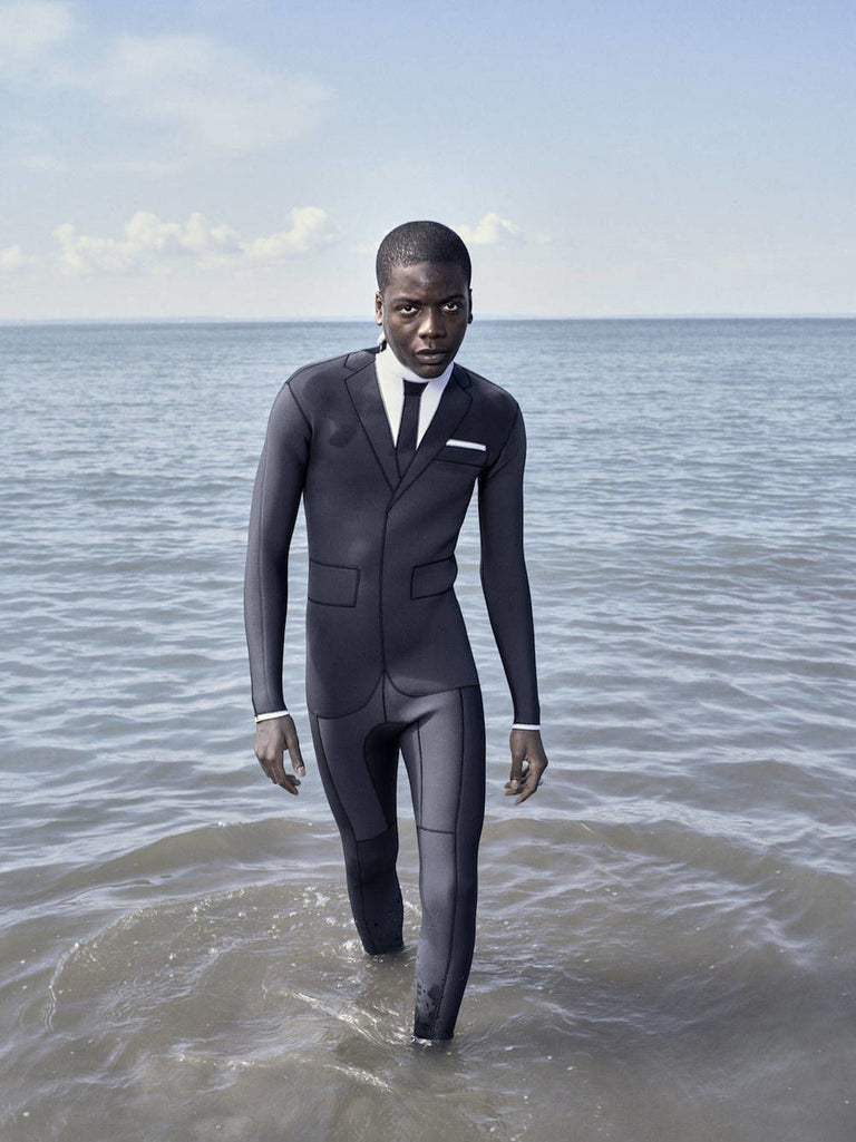 the thom browne beachwear collection is inspired by two strong but disparate areas of design, suiting and sport, fused together by the visual illusion of trompe l'oeile. in this version of the iconic wetsuit, elements of thom browne tailoring are reduced to coversitched seam details: the two piece sleeve, the topcollar and lapel of the jacket, the point collar and single knot of the tie, even the jacket's cutaway and the trouser cuffs. the singular wetsuit design is sleek and ergonomic, fitted to the body and protective of it.