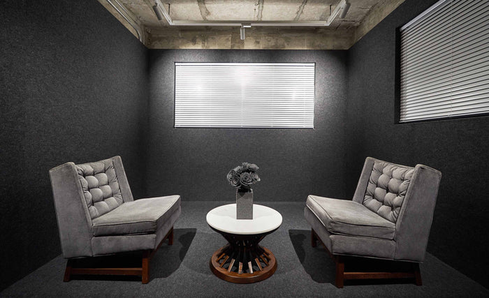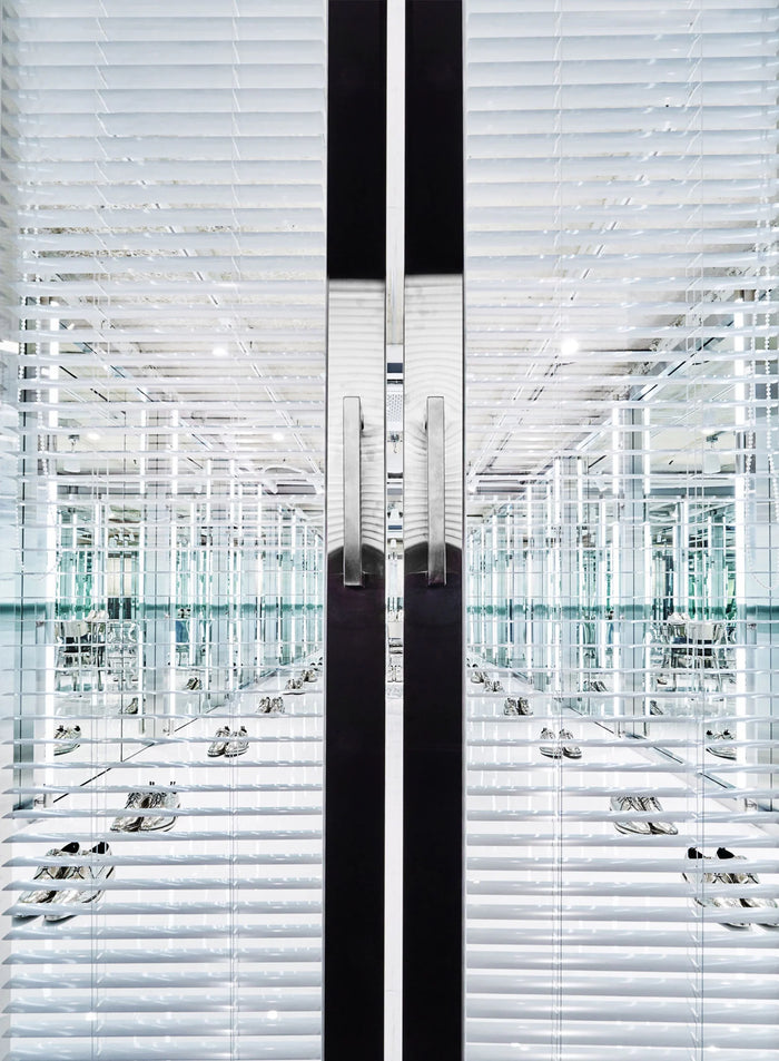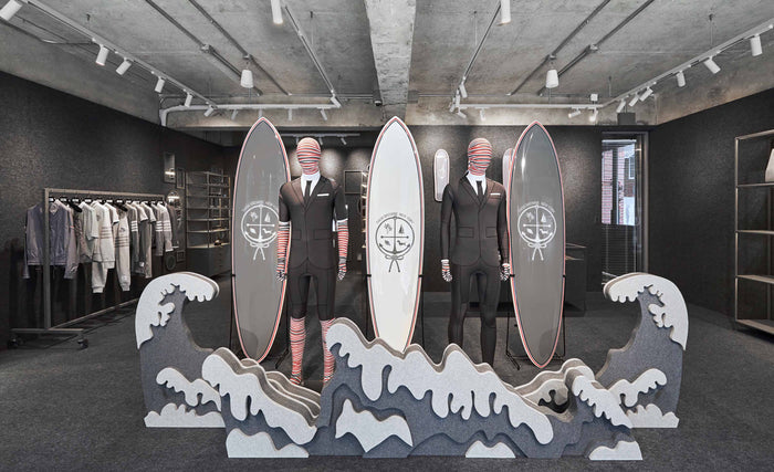 wrapped entirely in grey flannel, the space embodies thom’s vision of a grey beach, offering visitors an opportunity to surf a grey city.