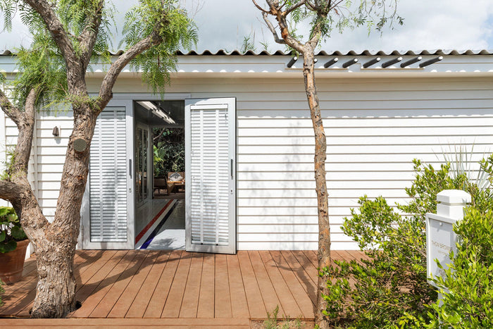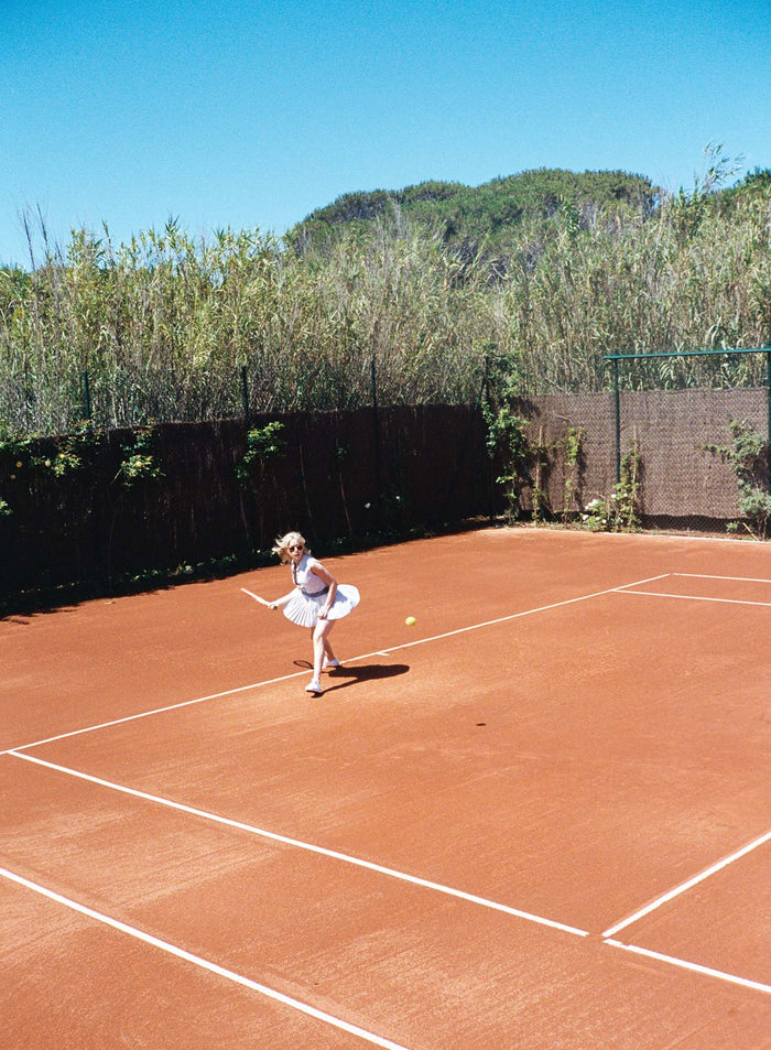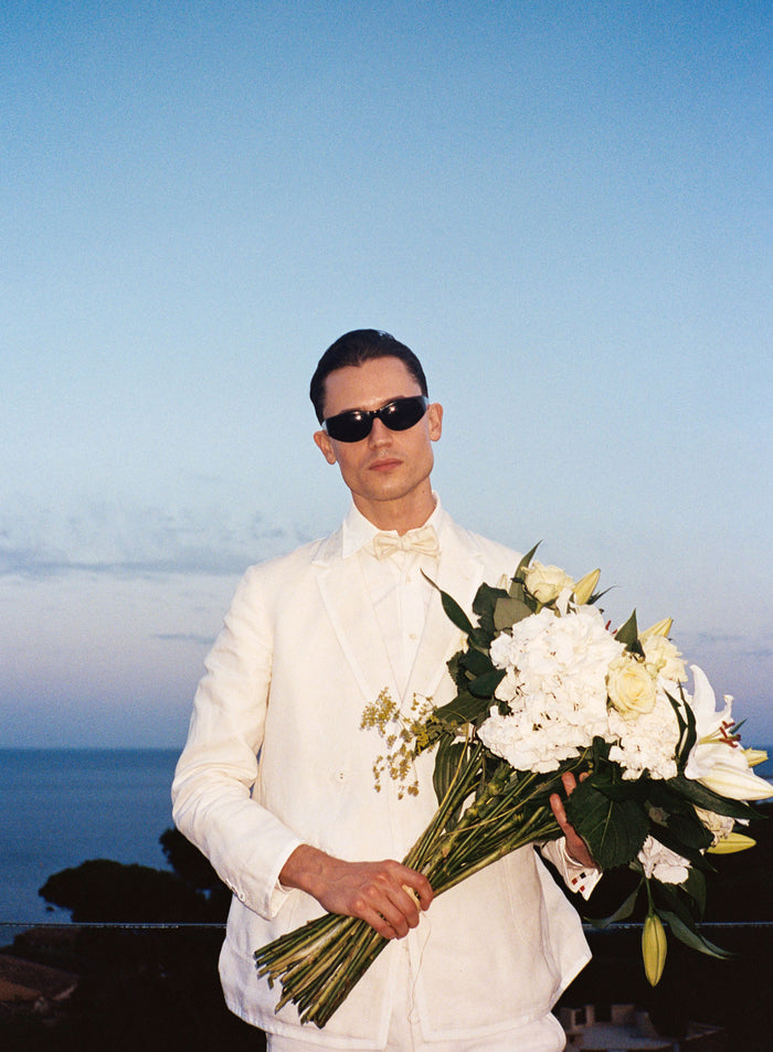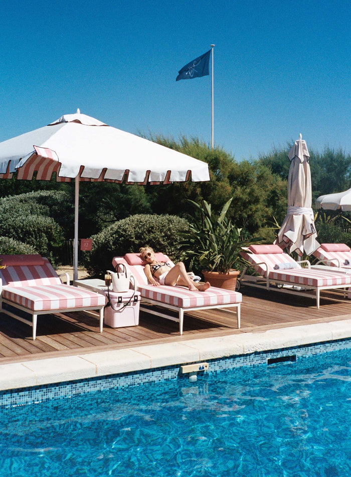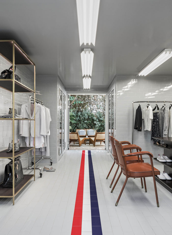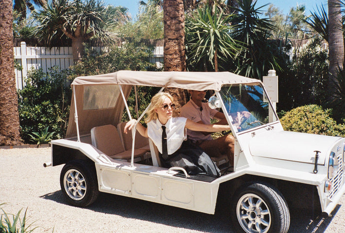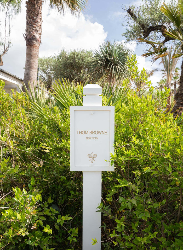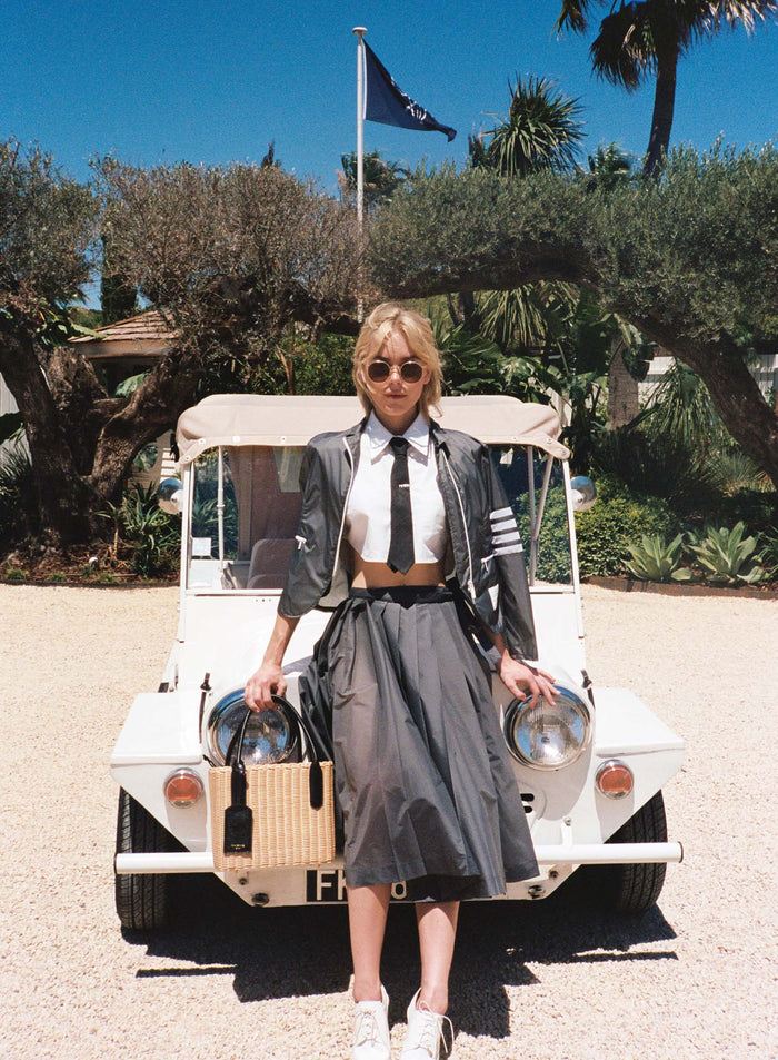 Model wears sand horse hair contrast leather frame mrs. thom jr. bagtb125 - white gold and brown pantos sunglasses