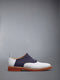 In Thom Browne’s signature study of material juxtaposition, this saddle shoe pairs a smooth white upper with a vibrant overlay. Set on a layered, flexible rubber sole, it merges structured form with relaxed versatility, styling effortlessly with both tailored and casual looks for a modern uniform statement.