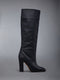 Knee high boot in black calf leather with broguing details through toe and 105mm covered block heel. Round toe. Slip on construction with foldover cuff. Leather sole and lining. Signature striped grosgrain loop tabs at cuffs.