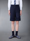 Sack short in navy flannel with engineered tonal 4-bar stripe detail at left thigh. Tab closure, beltloops, flat front, creased legs, wide cuffs. Slip side pockets, button-fastening back welt pockets. Signature striped grosgrain loop tab at back waist. Sack - Fit 2.