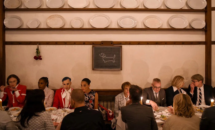 subtle interventions of signature thom browne details complement the perfect simplicity of the shaker inspired interior. a ribbon divides the long tables in two… hector’s silhouette drawn in chalk on the antique slate boards… greeters in classic grey tailoring guiding guests to their seats beneath grey wool bonnets…