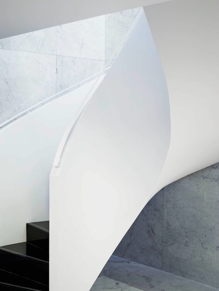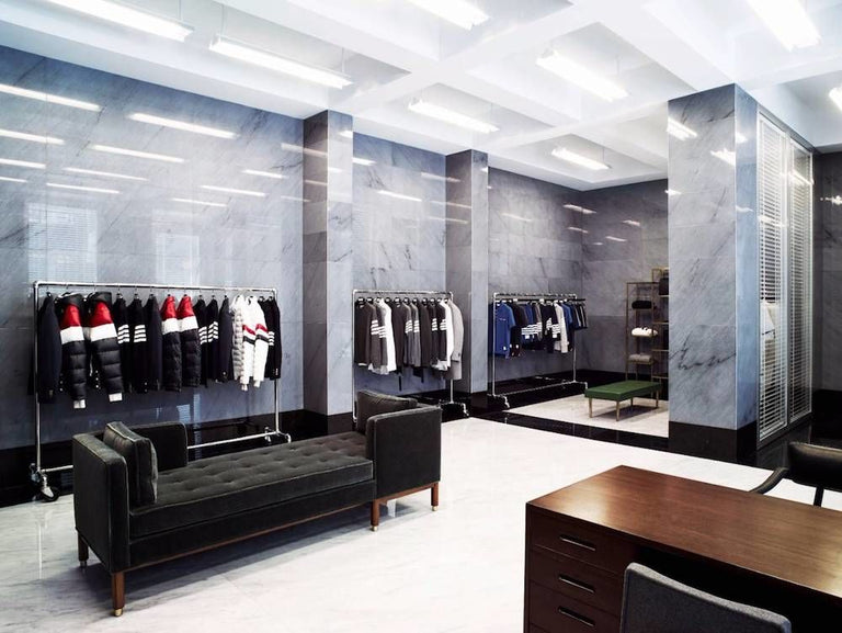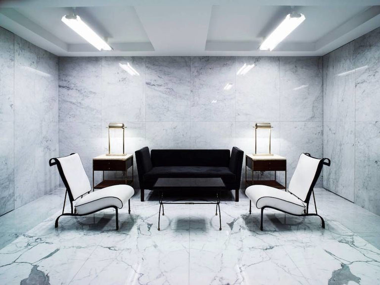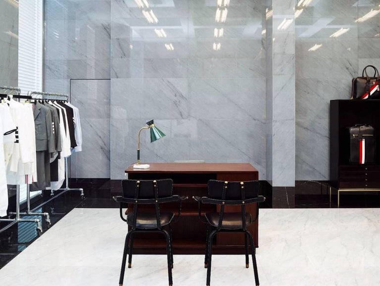 Behind Browne’s signature slat blind covered windows, a refined palette of grey, black and white translates his austere American sensibility for the English city. Men’s and women’s ready-to-wear and accessories collections are displayed on the ground floor, while to the right of the entrance, a floating spiral staircase leads down to the lower level’s fitting rooms and seating area. The furniture here - and throughout the store - are by American and French designers including Dunbar by Edward Wormley, Paul McCobb, Jacques Adnet, and Maison Jansen. Taking inspiration for the strict store aesthetic from mid-century office interiors, details include metal slat blinds, rows of florescent tube lighting, polished white Calacatta and Carerra marble floors, and banker grey Bardiglio and Carerra marble clad walls.