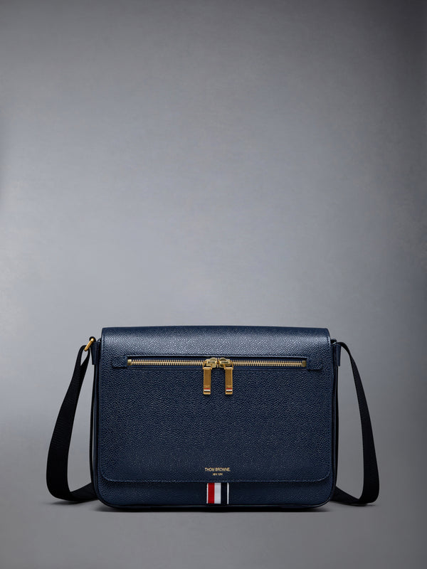 Reporter bag in blue pebble grain leather with black webbing strap. Flap top, 2-way zip pocket at front. Gold foil printed logo and signature striped grosgrain loop tab at entry.
