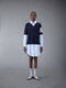 V-neck tee and round collar shirtdress combo in cotton Milano and blue cotton Oxford with 4-bar stripe detail at left sleeve in white. Front button closure, name tag applique at rounded hem, pleated buttoned cuffs. Buttoned side vents at tee with signature striped grosgrain trim. Signature striped grosgrain loop tab at back of neck.