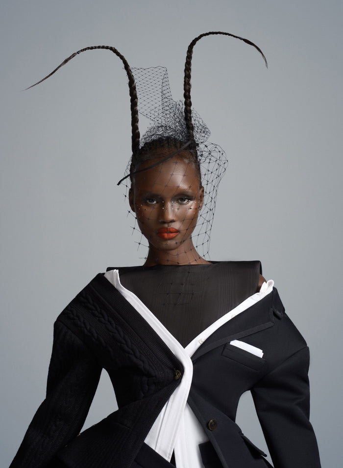 the raven, wrapped in a stole of shredded tuxedos—strips of black mohair and silk, canvas and lining, grosgrain and labels. below her trompe l'oeil bodice in white silk twill, spirals of hand-embroidered, feather-like ribbons wind down a crepe wool skirt.