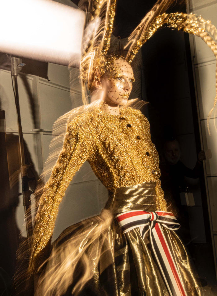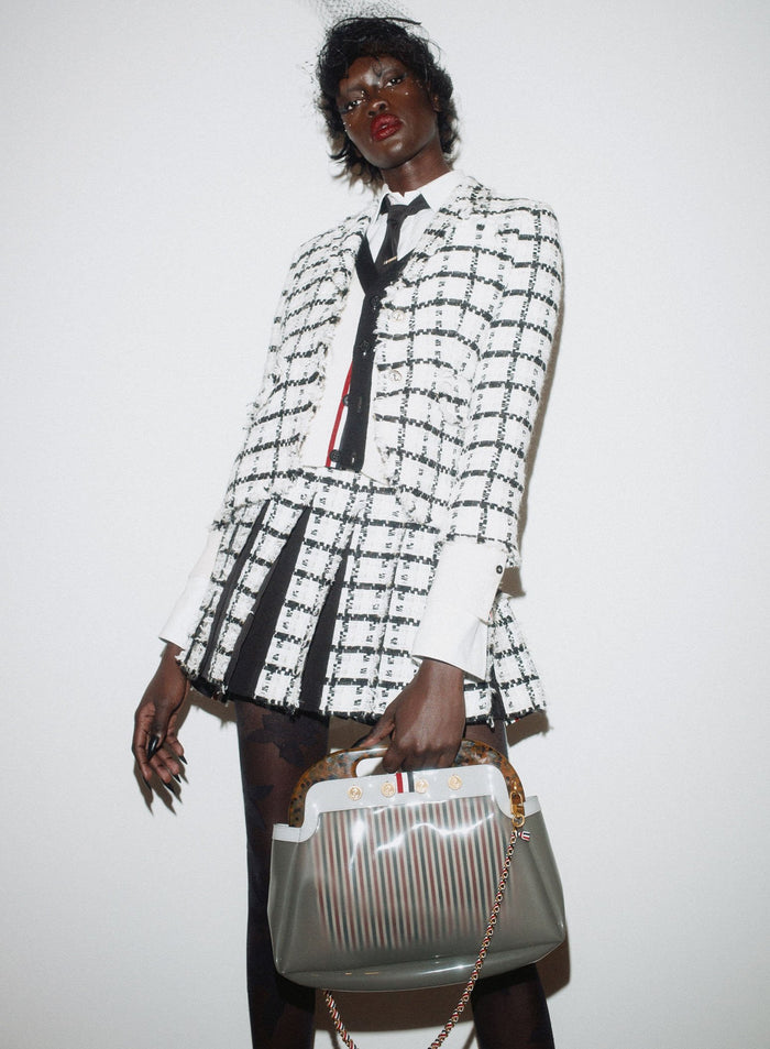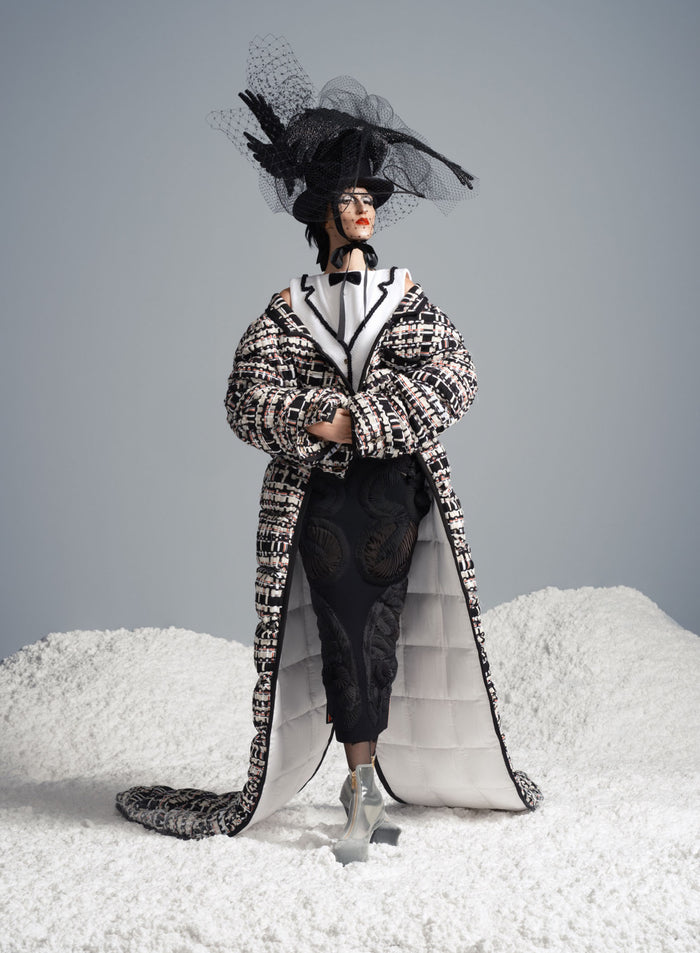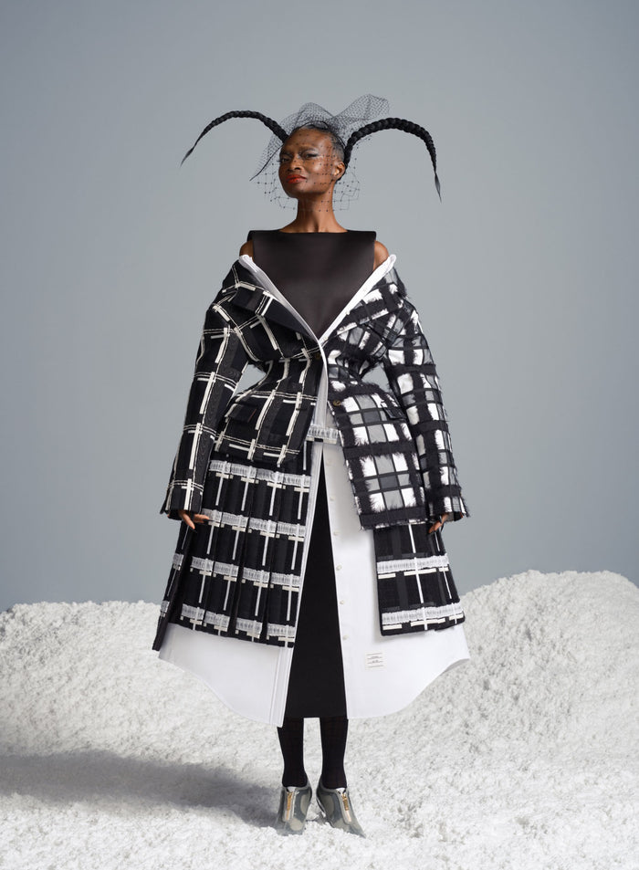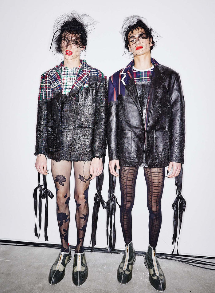 black tie ensembles are deconstructed and transformed into modular panels which button on and off one another. these body-skimming looks give way to cinched silhouettes made of dissected tailoring. some in fun-mix tweed and tartan made of grosgrain ribbons, others in intarsia and wool-cashmere—all defined by an hourglass shape.