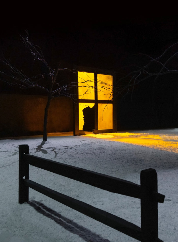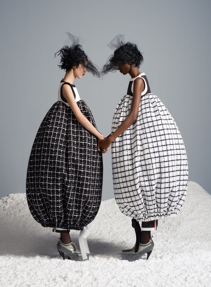 slow and steady, two figures in complementing black and white cashmere dresses. their gathered blouson capes in white silk satin and black moiré accented by bows. followed by boatneck poof dresses framed by intarsia cricket stripes and tweed skirts.
