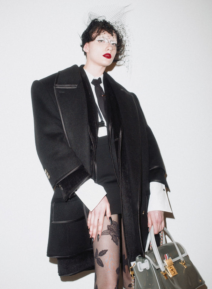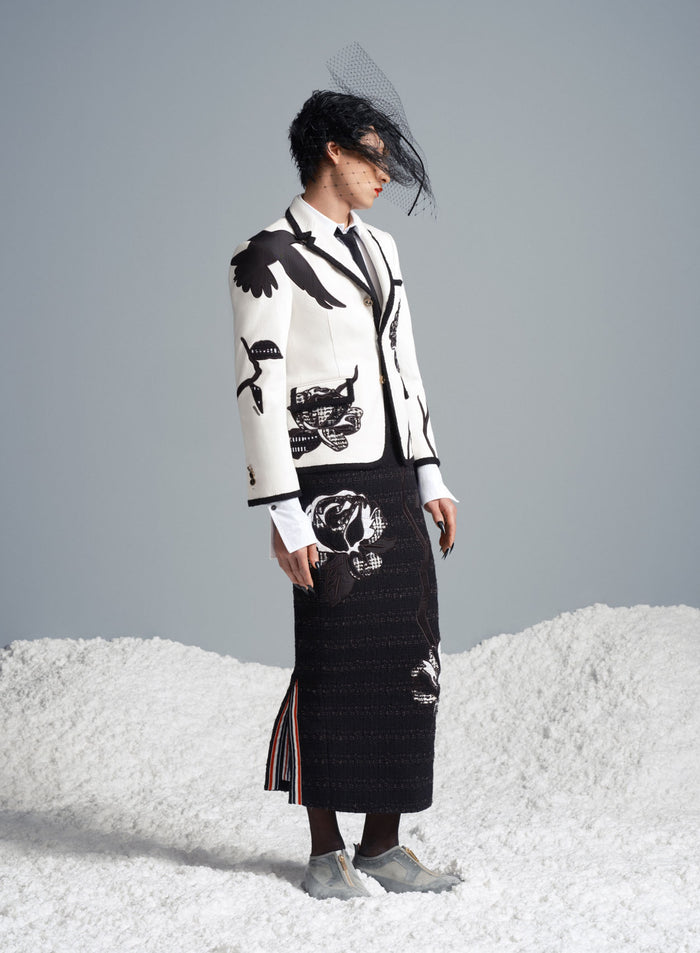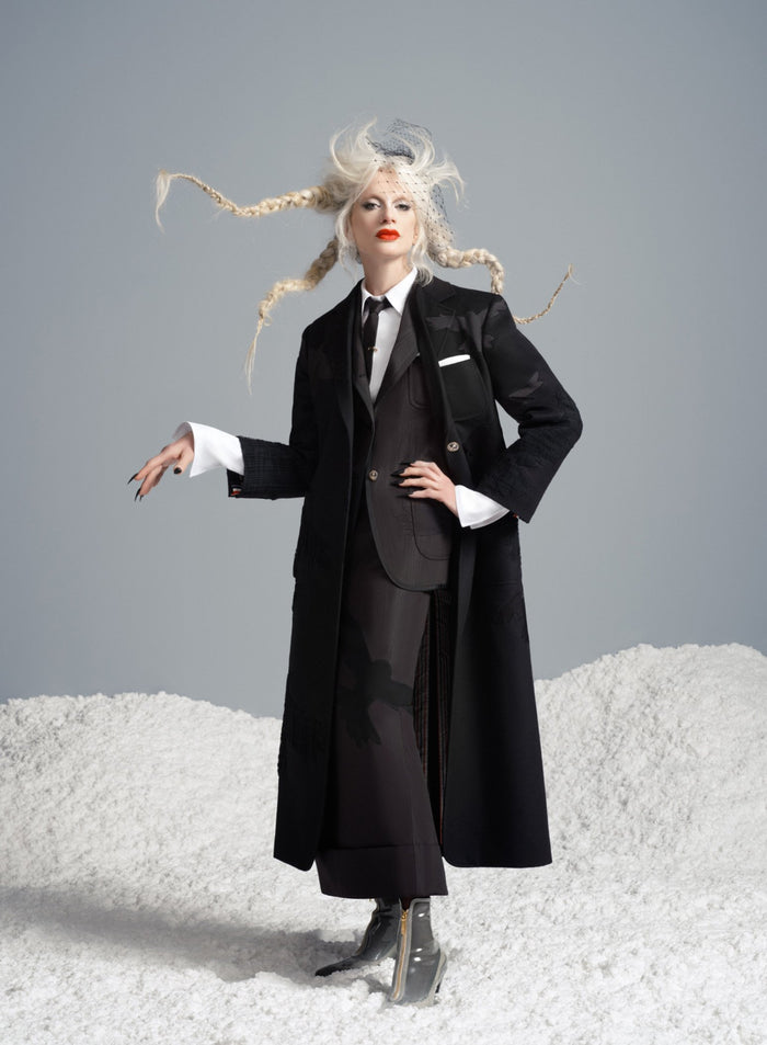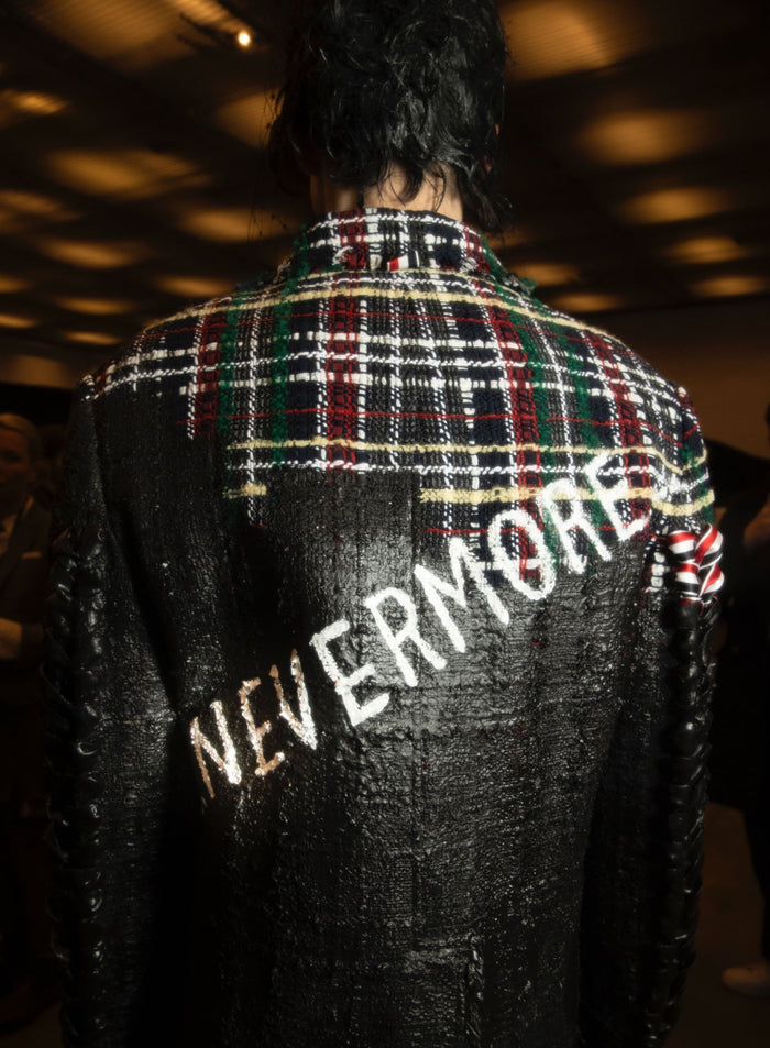 a school of ravens, in tailoring and coats with strong shoulders cut from military weight cashmere, hand-loomed tweeds, and bullion embroidery. among them, in wool flannel and velvet intarsia, stitched into white silk moiré. outerwear in shredded denim tweed, satin stitched roses, shearling, and leather is layered atop corsets that mimic cumberbunds.