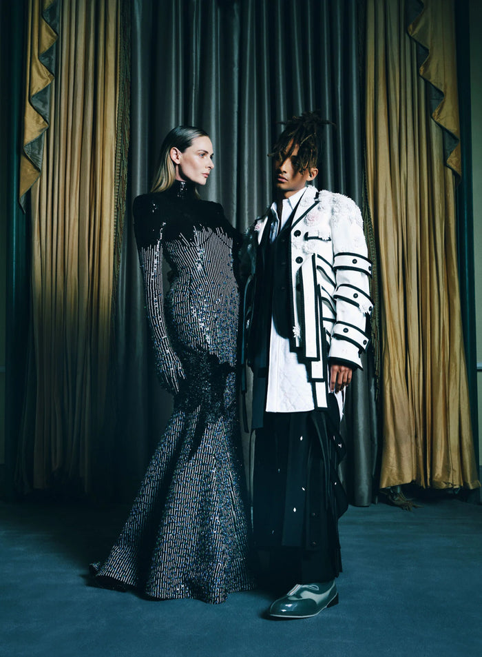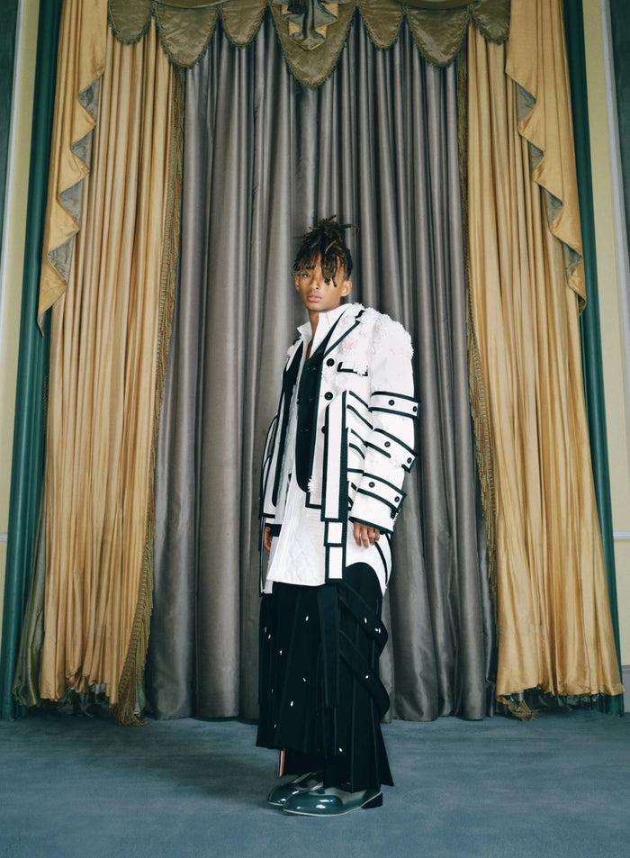 jaden wears a custom thom browne all-in-one modular coat in white denim, black wool mohair and cavalry twill, tipped in black grosgrain with a quilted white oxford shirt, applique white and pink dahlias with individually handpleated petals over trousers in black wool mohair with tuxedo stripe and black and white spectator boots with vinyl cover.