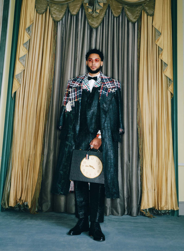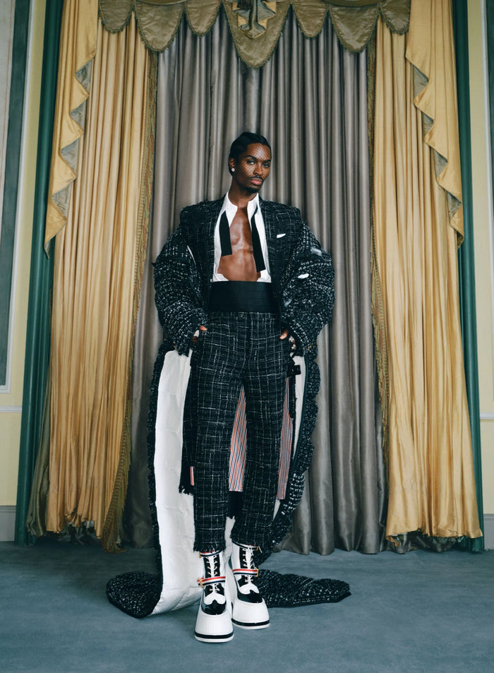 alton wears a custom thom browne oversized tailcoat in black deconstructed denim tweed with grosgrain tipping and appliqué hand-beaded leaves, reconstructed jacket and pleated skirt in black plaid ribbon tweed with silk faille tipping and appliqué bullion roses, and classic trousers in black plaid ribbon tweed with frayed edges worn with silk satin cummerbund and platform astronaut boots in black and white patent leather.