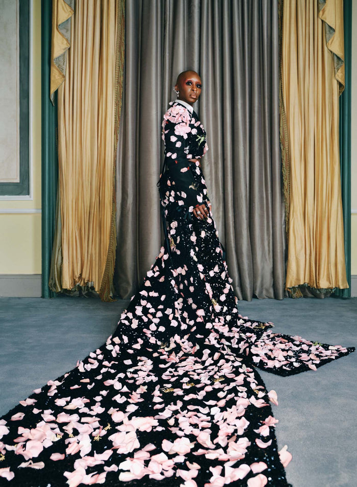 cynthia wears custom thom browne black sequin and lurex embroidery draped over a black silk faille tailored jacket and skirt with silk satin lacing detail with an overlay of 2000 pink silk moiré petals and 3D beaded insects individually sewn all over with white pique shirt, black silk satin tie, and black patent longwing on dot platforms.