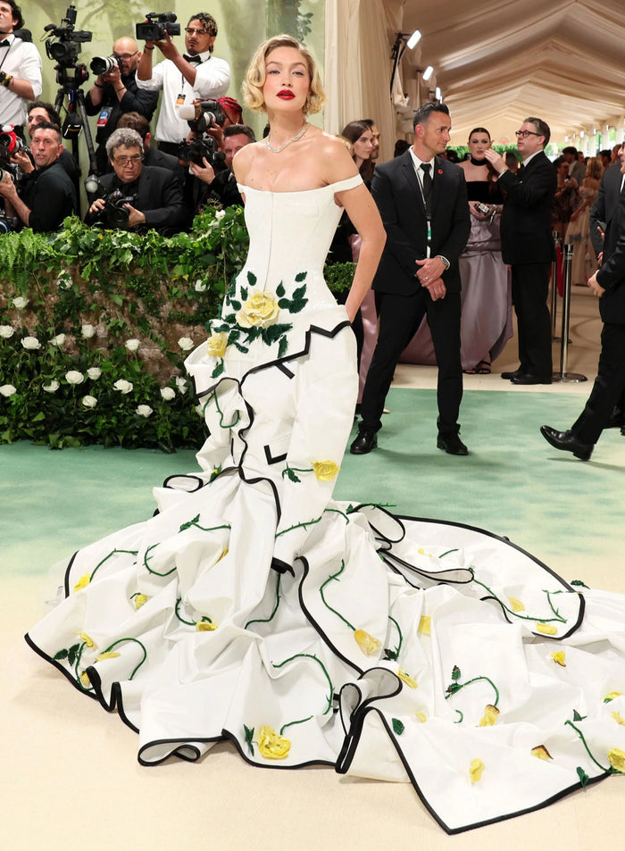 gigi wears a custom thom browne shiny white micro bugle bead corset dress with a 3D yellow rose embroidered detail. suspended from the exaggerated hip dress is a draped white silk moiré tailored jacket with black duchess satin tipping with an array of 3D yellow roses, green vines and thorns appliqued throughout. embroidery techniques and components include bullion, crystals, silk satin stitch and lovebird beads with white pebble wingtip pumps.