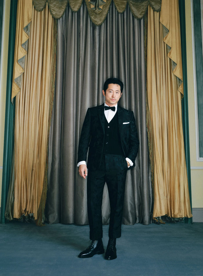 steven wears a thom browne made-to-measure fit 1 classic tuxedo suit in roses and ravens tonal black jacquard, tipped in black grosgrain with classic baby cable knitted vest in black cashmere with blucher cut tuxedo shoes in black patent leather and umbrella with gold raven handle.
