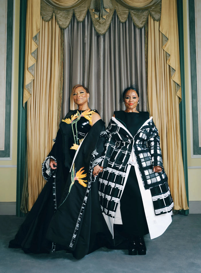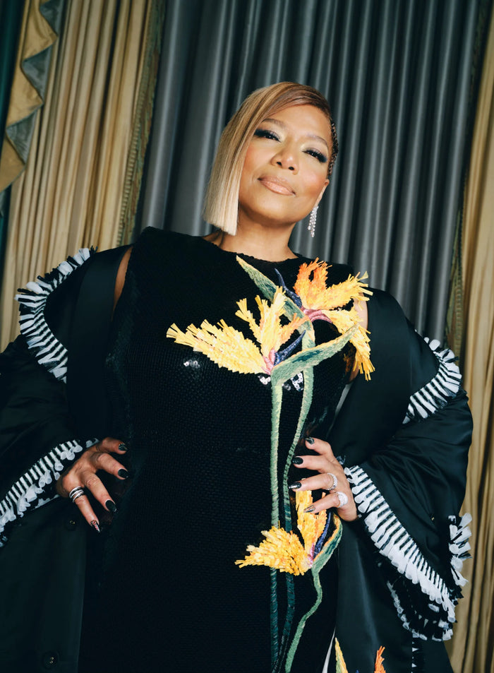 queen latifah wears a custom thom browne black peau de soie gathered coat with raffia and bugle bead fray tipping over a black sequin square shoulder dress with embroidered bird of paradise made from bullion, frayed raffia, and satin stitch chiffon with long wing brogue heels in black sequins.