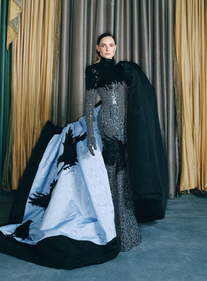 rebecca wears a custom thom browne black and white shiny sequin rep stripe high neck dress with exaggerated hip detail with a degrade of green and blue swarovski crystal florets embroidered throughout. the embroidered flying black ravens are made from frayed raffia, petaled raffia, lurex, and sequins. over the dress is a black silk moiré gathered cape with a blue moiré lining and matching embroidered raven appliques. shoes are platform heel-less saddle boots in black nubuck.