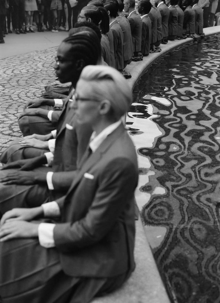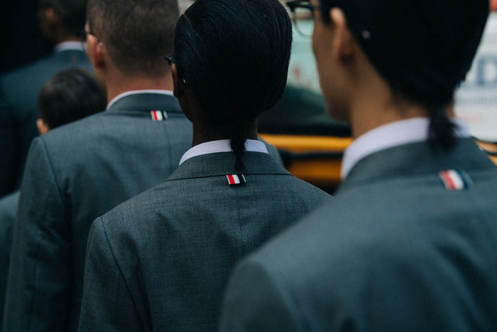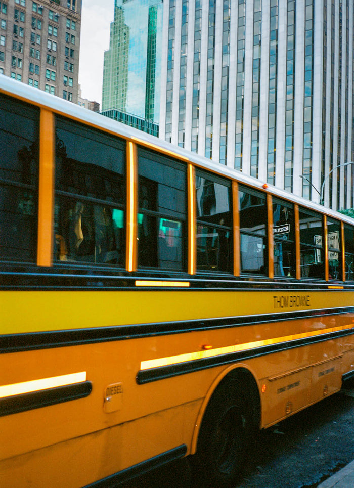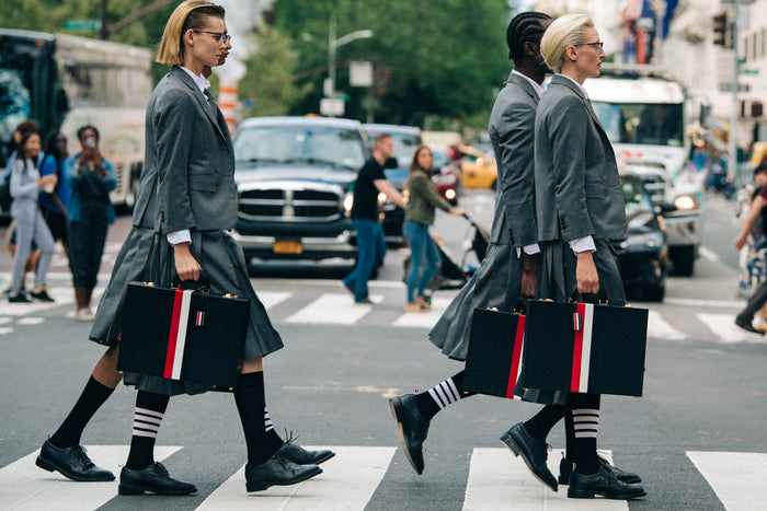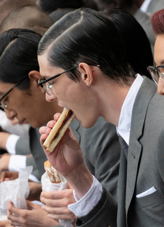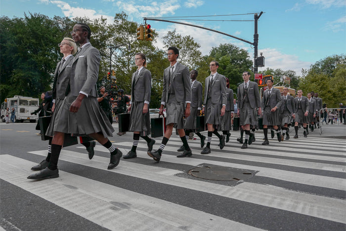 ten women and ten men arrive by thom browne school bus. dressed in thom browne’s classic grey jacket and grey pleated skirt, grey tie, grey cardigan, white oxford shirt, and longwing brogues with black four-bar socks, and carrying identical thom browne black pebbled leather hard briefcases, they are a living tableaux of uniformity and repetition.