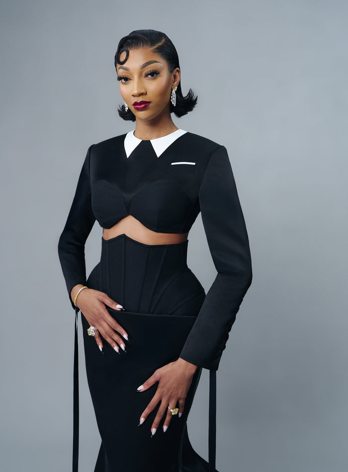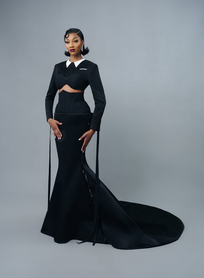 angel wears a custom thom browne black duchess satin trompe l’oeil cropped jacket with silk satin lacing and contrasting 3-ply mohair cups, an exaggerated hip corset and a matching drop-waist skirt with an extended train. the skirt, embroidered with a shiny black bugle bead tuxedo stripe. her shoes are low throat wingtip pumps in black patent leather…