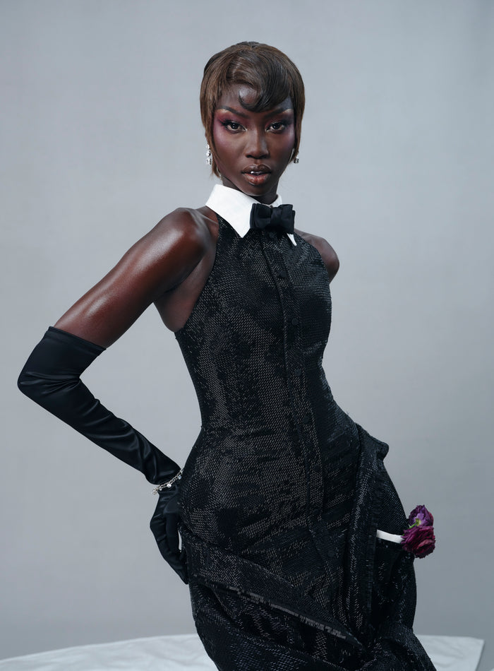 anok wears a custom thom browne black corset shirtdress with 1,135,000 bugle beads, embroidered throughout the entire look, in a crisscross pattern with exaggerated hip detailing. 9,900 hours of hand work brought together with a matching black beaded draped jacket tied over the hips and a white moiré overcoat skirt. her shoes, a low throat wingtip pump in black and white patent leather…