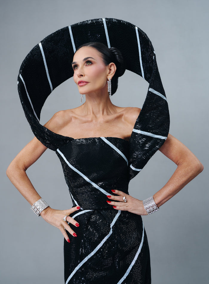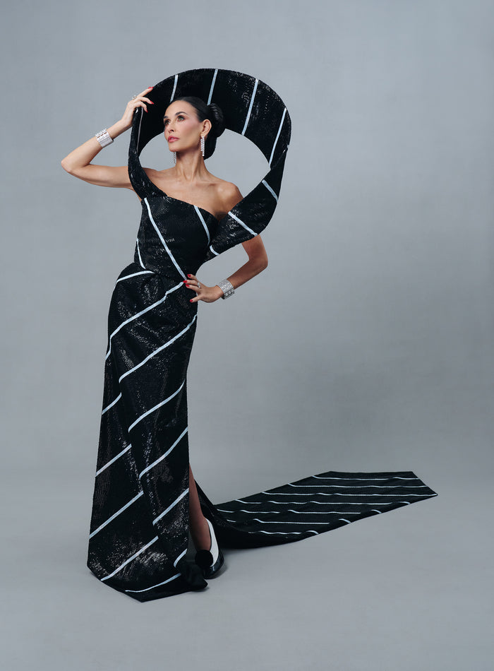 embroidered with over 1,400,000 beads, including 222,000 pieces of black rectangle sequins, 1,093,500 pieces of black bugle beads, and 103,500 pieces of black cut beads, demi wears a custom thom browne sculptural black and white tie dress, a creation brought together with 7,600 hours of handwork, with shiny bugle and cut beads, and pom pom block-heel opera pumps in black patent leather and suede…