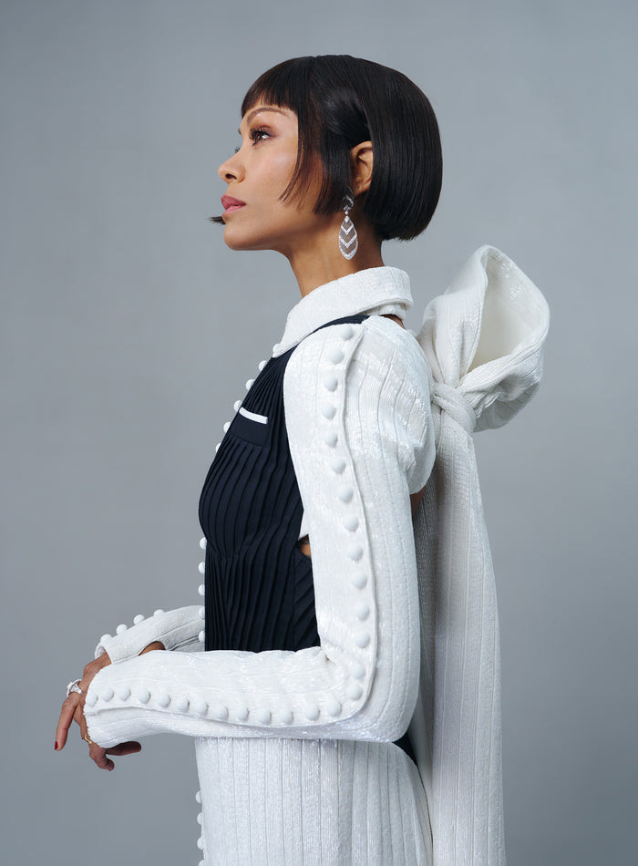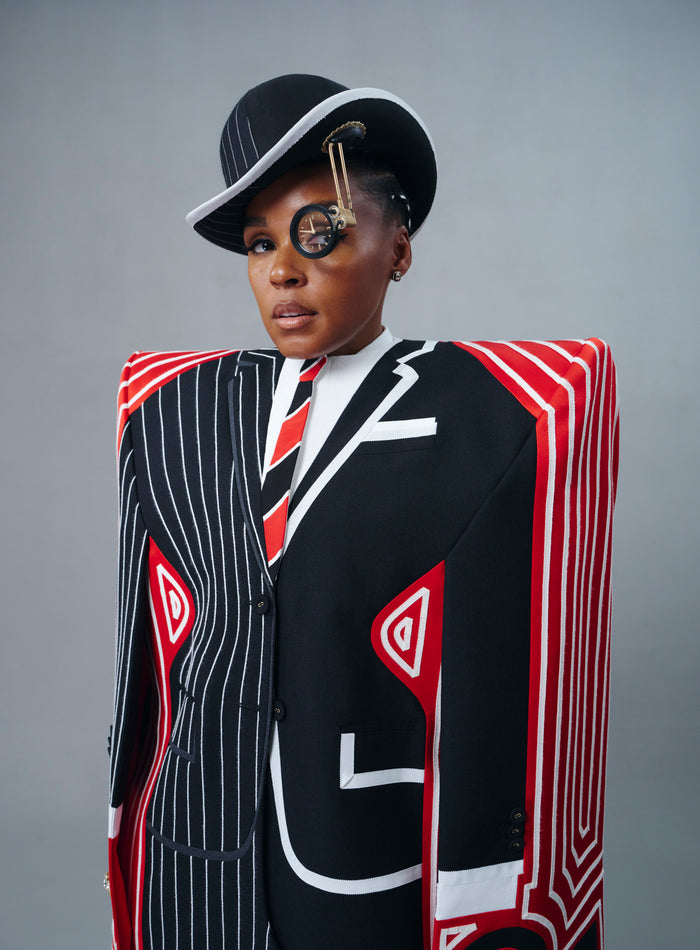 janelle wears a custom thom browne oversized trompe l’oeil suit cape half realized in 3-ply mohair with white radial stitch grosgrain tipping, and half finished in embroidered pinstripe intarsia into red double duchess silk, with embroidered radial outlines in grosgrain ribbons…